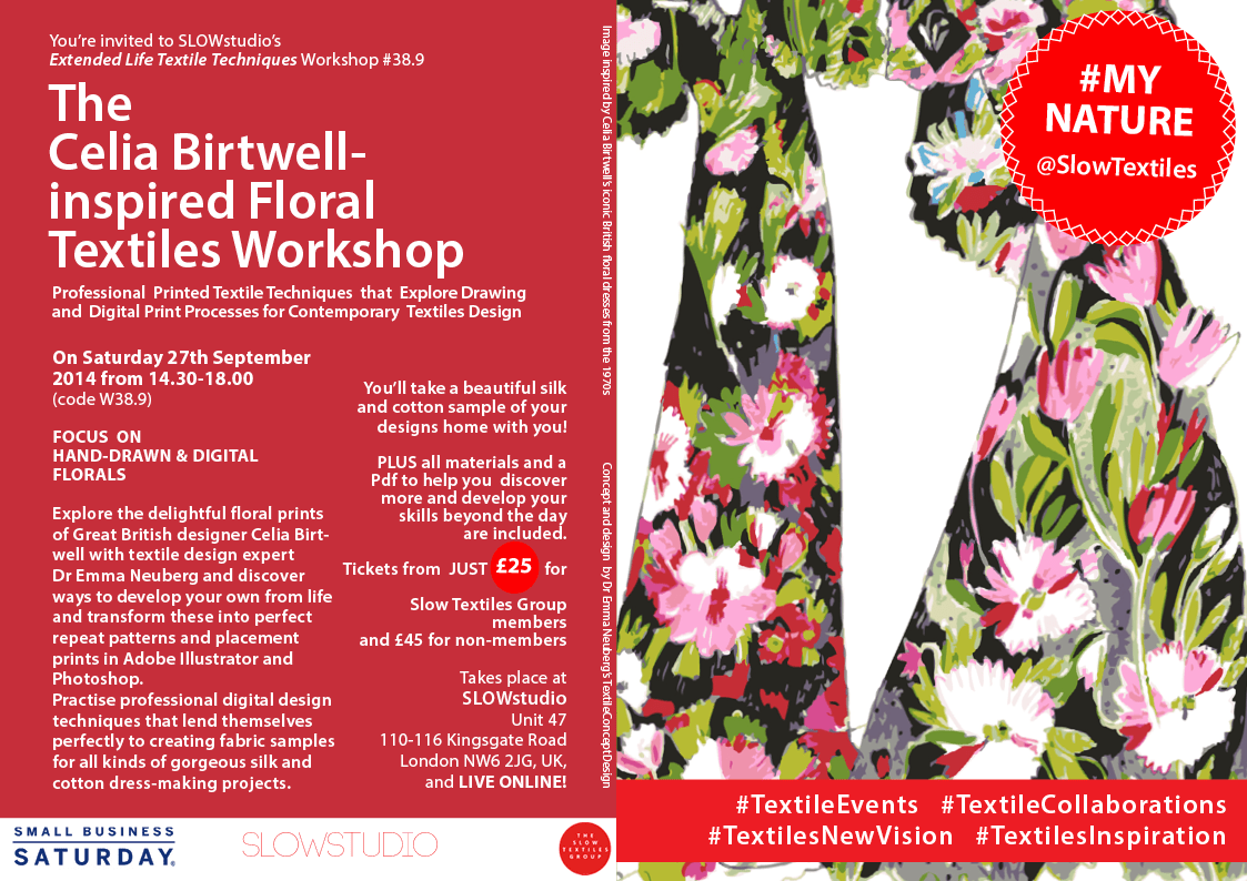 Online Attendance Tickets are available for your convenience from just £25 (Slow Textiles Group Members’ price). We use Google+ Hangout which is easy to use (all you need is a Google+ account). Alternatively, come to the London studio to gain the full experience of an exciting professional textile design studio, personal tutoring, group experience and learning, Slow Textiles handouts and realia, new work made with professional materials, embodied knowledge, networking, a glass of wine and refreshments fun from just £25 (Slow Textiles Group Members’ price)!